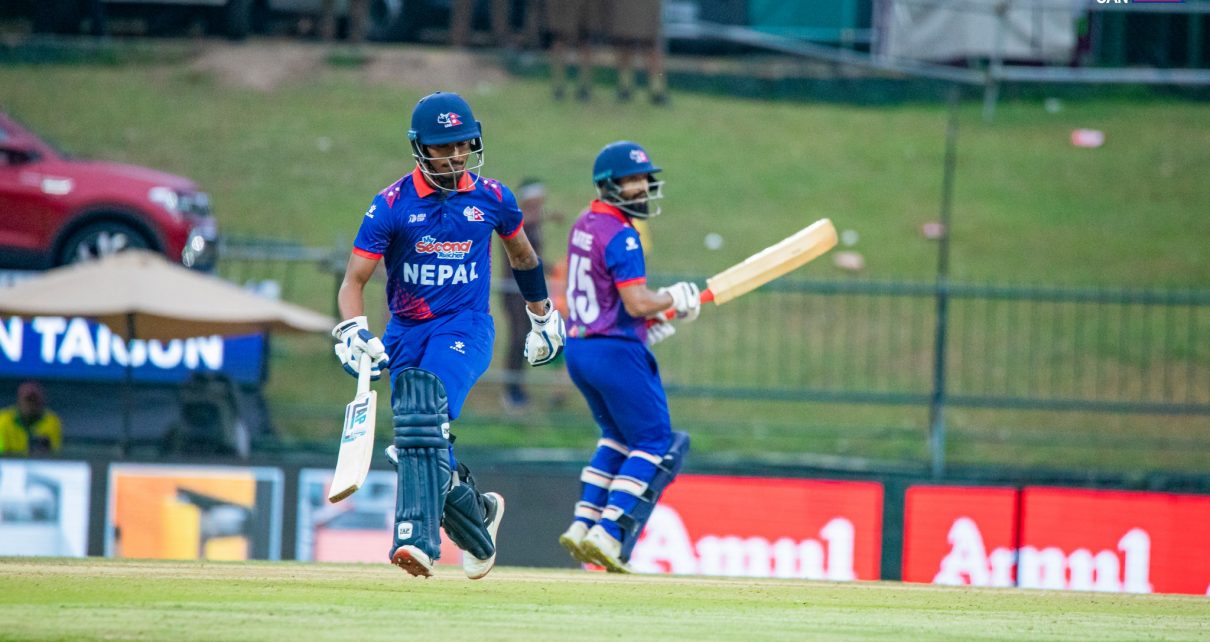 नेपालले व्याटीङ गर्ने क्रममा कुशल भुर्तेल र आसिफ शेखले १० ओभरभित्र ६५ रन जोडी नेपाललाई दिलाएको राम्रो सुरुवात मध्यक्रमका ब्याटरले इनिङ्स तानेका थिए । कुशलसहित भीम सार्की, कप्तान रोहित पौडेल र कुशल मल्ल छोटो समयमा आउट भए पनि आसिफ शेखले संयमतापूर्वक खेल्दै अर्धशक पूरा गरेका थिए ।