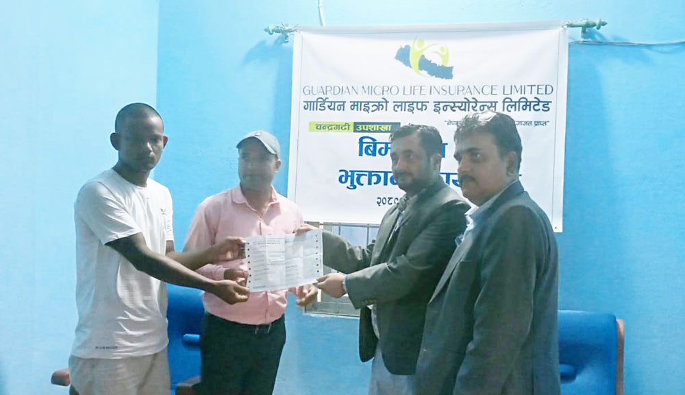 बिमा दाबी भुक्तानी गार्डियन माइक्रो बिमा कम्पनीले बिर्तामोडमा एक कार्यक्रमका बीच बिमा प्राधिकरण कोशी प्रदेश प्रमुख विनोदकुमार पोख्रेल, बिर्तामोड नगरपालिका वडा–४ का वडाध्यक्ष राहुलकुमार शर्मा, गार्डियन माइक्रो लाइफ इन्स्योरेन्स कम्पनीका प्रदेश प्रमुख महेश निरौलालगायतको उपस्थितिमा डिजिटल माध्यमबाट बिमा दाबी भुक्तानी हस्तान्तरण गरिएको थियो ।