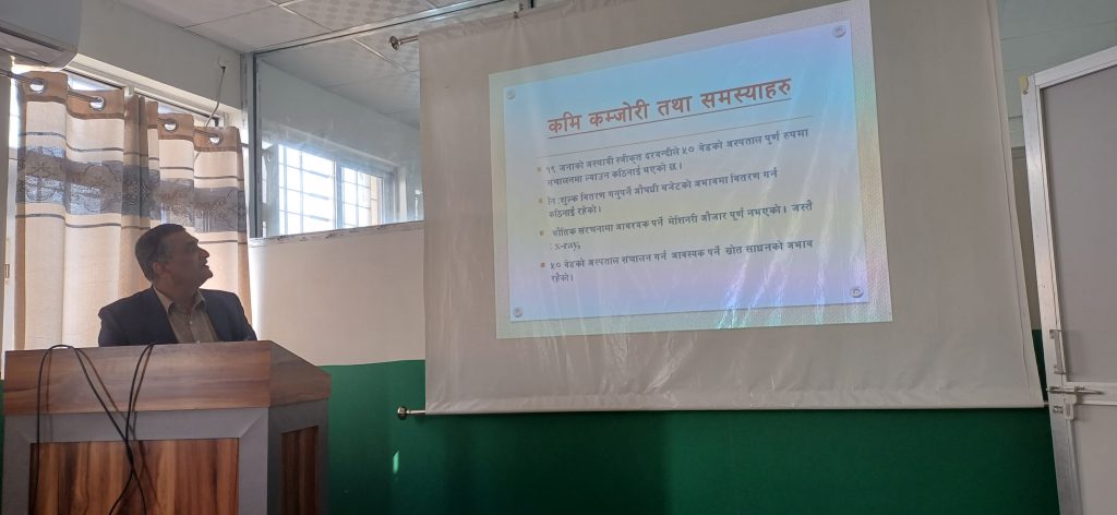 जनशक्ति, बजेट र औषधि अभाव भएपनि सेवालाई प्रभावकारी र विस्तारित रुपमा दिनलाइ लागि परेको उनले जनाए । थोरै जनशक्ति भएपनि पञ्चकर्म, भिडियो एक्स रे, ल्याव लगायतको सेवा शुरु गरिएको छ, उनले भने । इमरजेन्सि सेवा विस्तारको लागि पनि आवश्यक काम गरिरहेका छौ,उनी भन्छन् ।