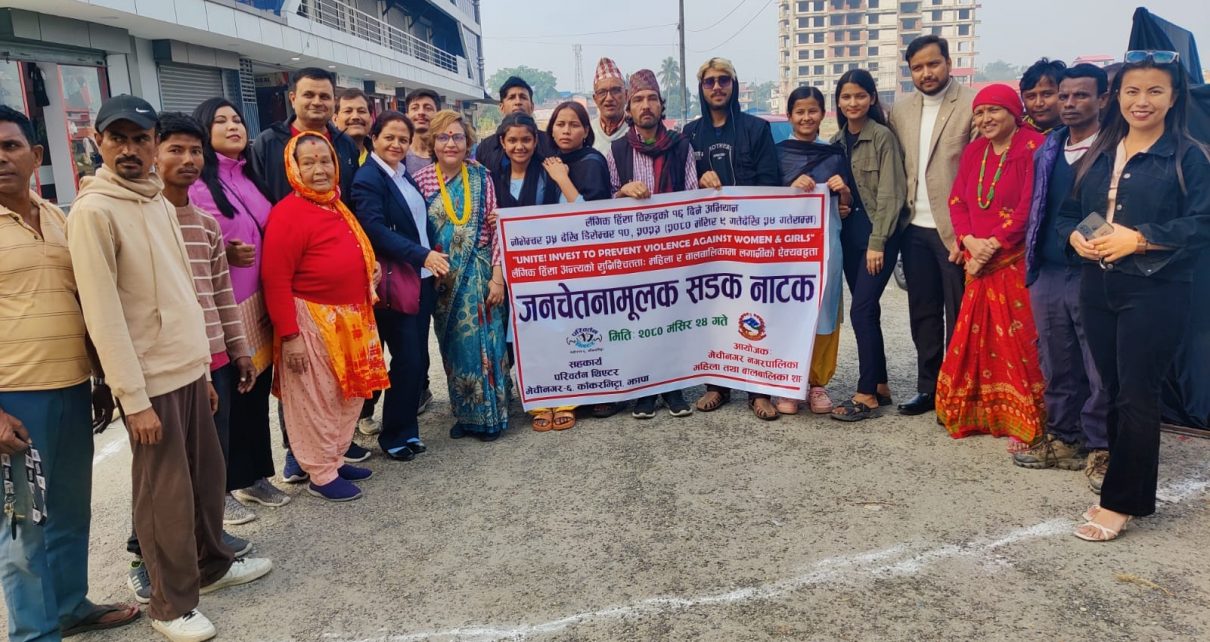 मेचीनगर । मेचीनगर नगरपालिकाले लैंगिक हिंसा बिरुद्धको १६ दिने अभियान अन्तर्गत जनचेतनामुलक सडकनाटक प्रस्तुत गरेको छ । नगरपालिकाको आयोजना तथा परिवर्तन थिएटर काँकरभिट्टाका कलाकारहरुको प्रस्तुतीमा मेचीनगर-१० स्थित धुलाबारी मोडमा लैंगिक हिंसा बिरुद्ध जनचेतनामुलक सडकनाटक प्रस्तुत गरेको हो । नगरपालिकाले मंसिर ११ गतेदेखि नै विभिन्न कार्यक्रम गरी लैंगिक हिंसा बिरुद्धको १६ दिने अभियान सफल पार्न लागि Read More…