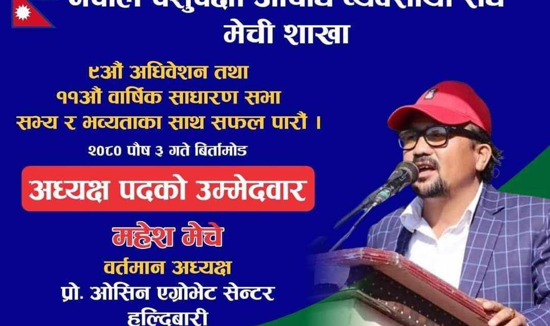 मंगलबार विर्तामोडा हुने नेपाल पशुपंक्षी औषधि व्यवसायी संघ मेची शाखाको ९औं अधिवेशन तथा ११ वार्षिक साधारणसभा आफुले अध्यक्ष पदमा उम्मेदवारी दिने मेचेले बताए ।