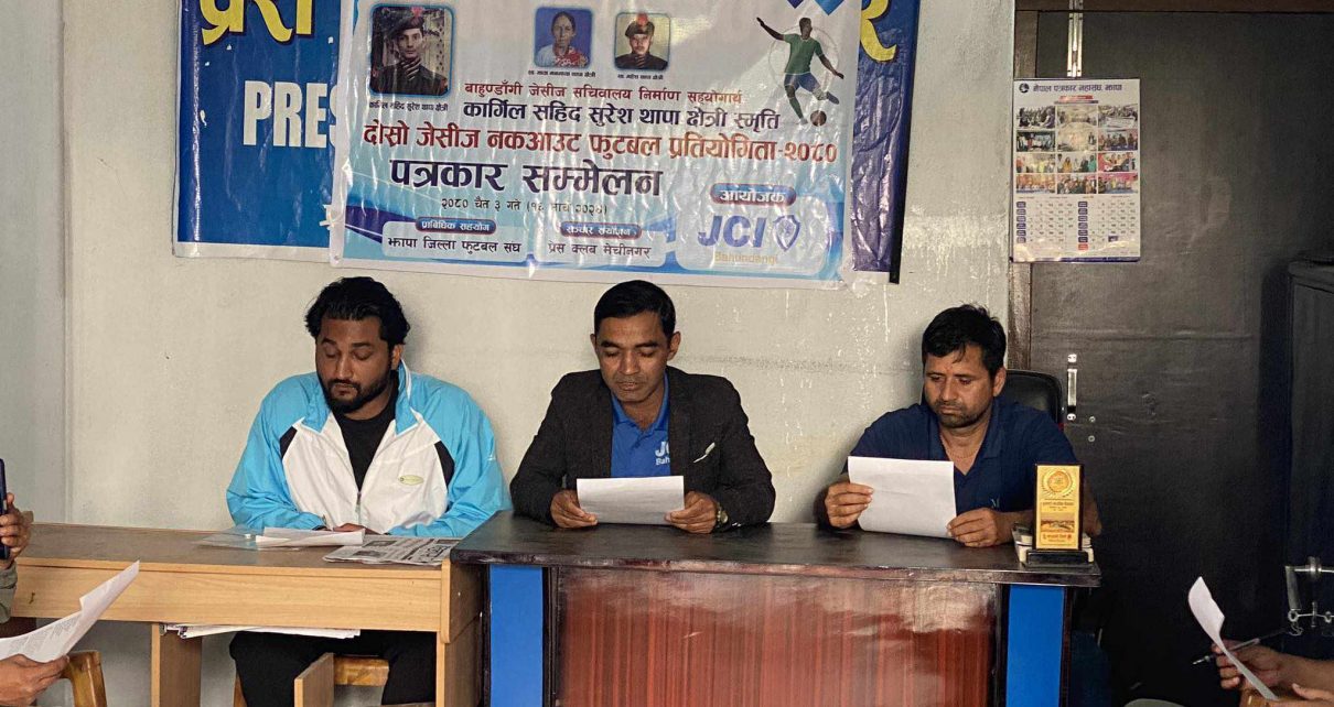 बाहुनडाँगी । बाहुनडाँगी जेसीजले कार्गिल सहिद सुरेश थापा क्षेत्रीको स्मृतिमा दोस्रो जेसीज नकआउट फूटवल प्रतियोगिता आयोजना गर्ने भएको छ । जेसीजले शनिवार प्रेस क्लव मेचीनगरमा पत्रकार सम्मेलन आयोजना गरेर कार्यक्रमका बारेमा जानकारी दिएको हो । जेसीज वर्ष २०२४ का अध्यक्ष देबु बानियाँको अध्यक्षतामा आयोजित पत्रकार सम्मेलनमा जेसीजले आगामी चैत्र १५ गतेदेखि २२ गते सम्म कार्गिल सहिद Read More…