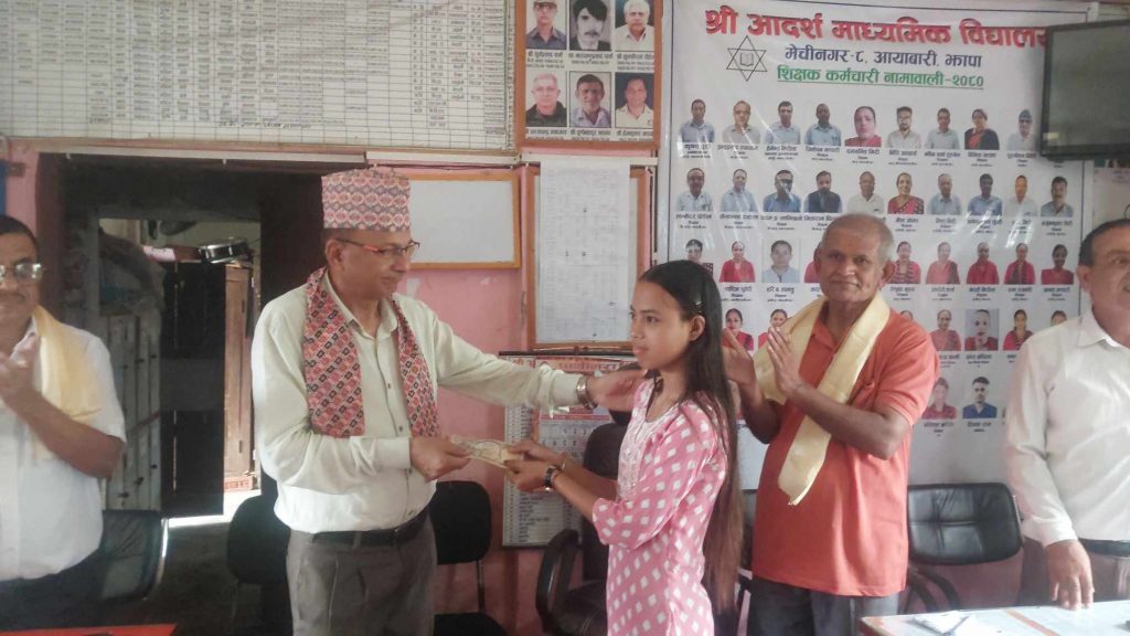 आइतबार आदर्श माविको विद्यार्थीलाई छात्रवृत्ति वितरण गर्न मेचीनगर प्रमुख गोपालचन्द्र बुढाथोकी र नगर शिक्षा अधिकारी होम भण्डारी विद्यालयमै पुगेर विद्यार्थीलाई छात्रवृत्ति वितरण गरे ।