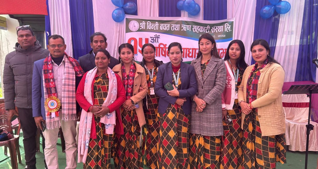 मेचीनगर । बिन्ती बचत तथा ऋण सहकारी संस्थाको १५ औँ वार्षिक साधारणसभा शनिबार सम्पन्न भएको छ । मेचीनगर–८ स्थित संस्थाको कार्यालय प्राङ्गणमा सम्पन्न भएको साधारणसभामा विभिन्न व्यक्तित्वलाई सम्मान गरिएको थियो । कार्यक्रममा उत्कृष्ट बचतकर्तातर्फ लक्ष्मण उराँव र अम्बिका रम्तेल, असल ऋणीतर्फ दिपा राजवंशी र बाबुराम तामाङ तथा उत्कृष्ट कर्मचारीको रुपमा संगीता ढकाल र डम्बरकुमारी शर्मालाई Read More…